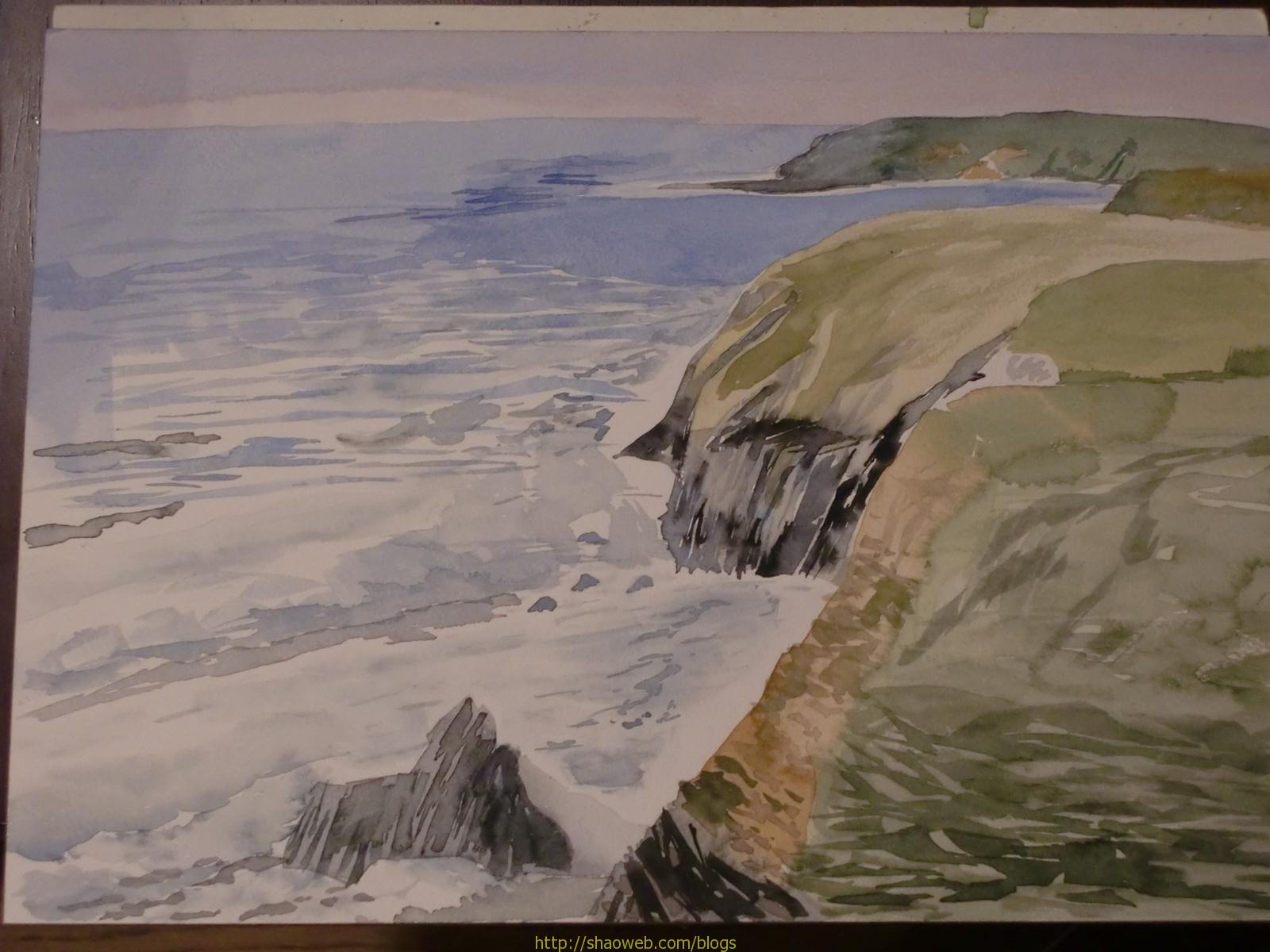 我的画花了两节课–大概两个小时。上个星期选的图,画了轮廓,远处的天与水,近处岩石打底色。昨天晚上画近处水浪,岩石加细节。