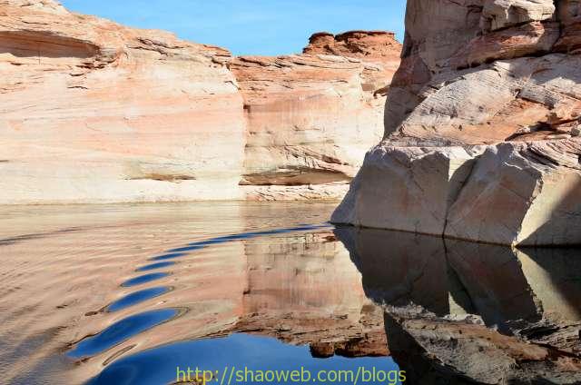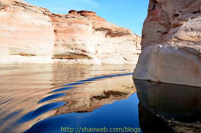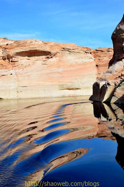 我们没有沿着主水道一直开下去,而是去看了一眼水坝,开进了羚羊峡谷(Antelop Canyon). 早上风平浪静,前面没有其他游船搅乱水面,所以我们才能看到两岸起伏连绵的多彩山石清晰的水中倒影,一路上峰回水转,美不胜收。