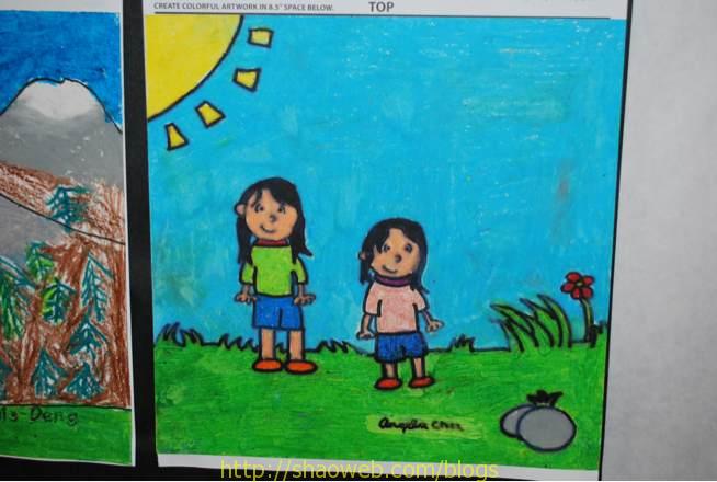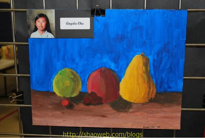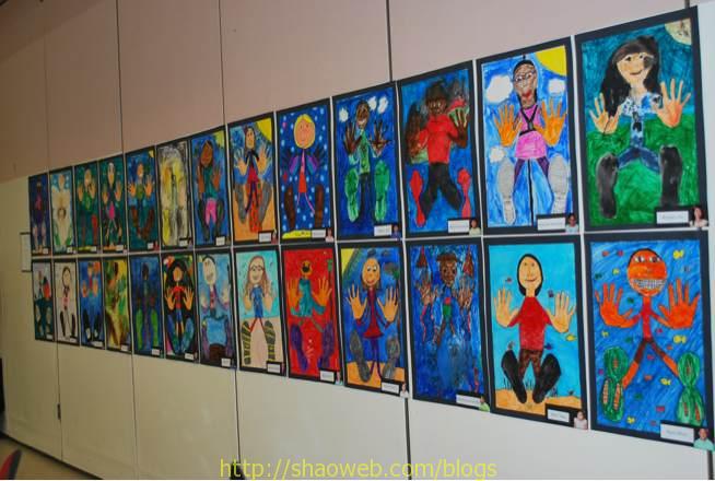 艺术展和合唱表演 (Art walk and singing show) 今天晚上学校举行艺术展览,把孩子们这学期的艺术品都摆出来展示一下。 安妮班上的全家福: 安琪班上的: 安琪班上的静物临摹: 朋友孩子班上的,二年级,把手和脚拓印出来加上身子其他部分。安琪也曾经干过: 安妮的全家福: 安琪的临摹: 安琪的姐妹俩: 还有学前班,一二年级的合唱表演。(谁照的这张?!难道是我?!豆腐块快拿来!) Share this:ShareEmailPrintFacebookPinterestLinkedInTwitterTumblrRedditPocket