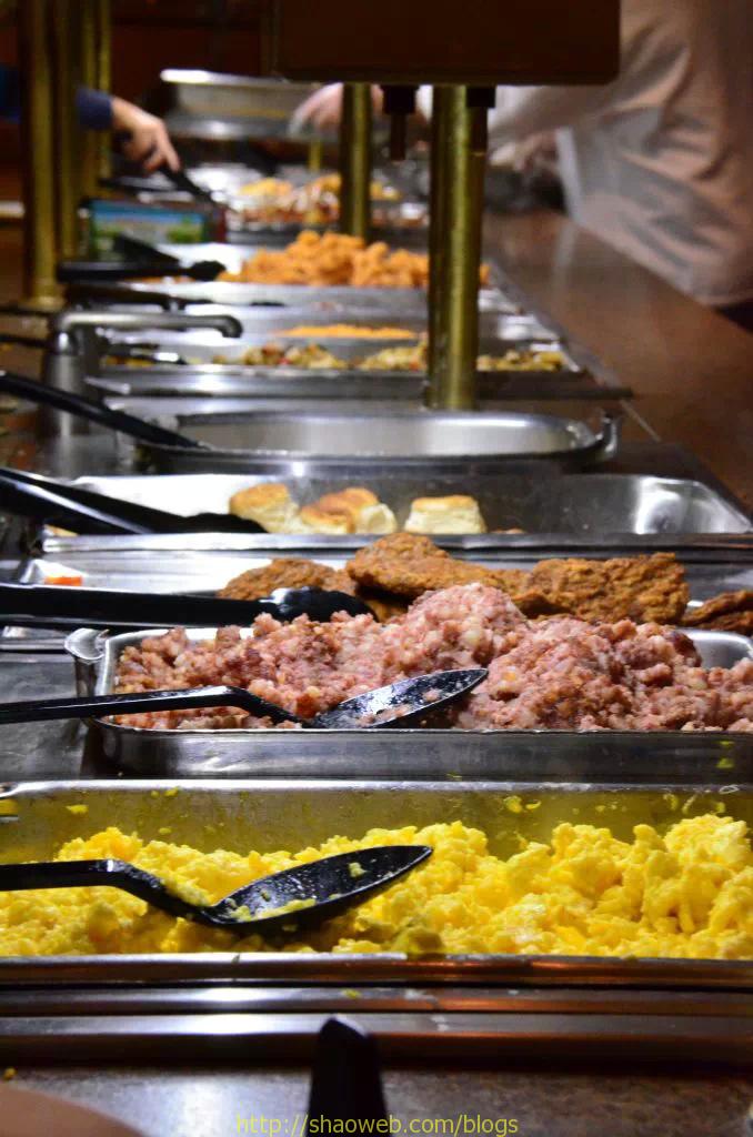 我们看到的第一家有明显自助餐标志的就是Circus Circus,早上7点到11点供应早餐,11点到2点午餐,4:30到10点晚餐。我们快将近11点钟的时候进去的,付的是早餐钱,虽然号称11点以后就是午餐,可是午餐的东西大约快12点的时候才上来,只不过是一些土豆泥,汉堡,烤肉之类的,还没有早餐丰富,好在早餐的东西也没收,还一直供应不断。